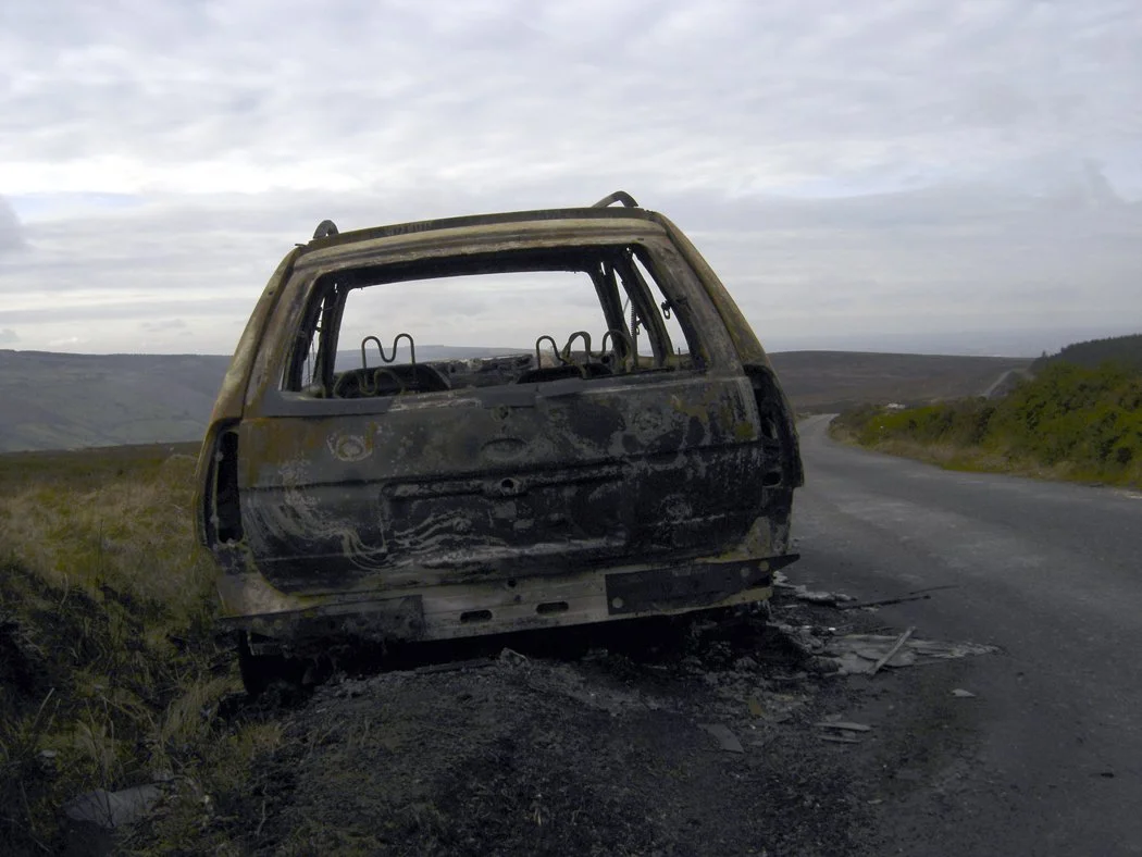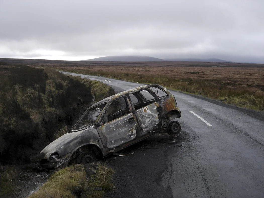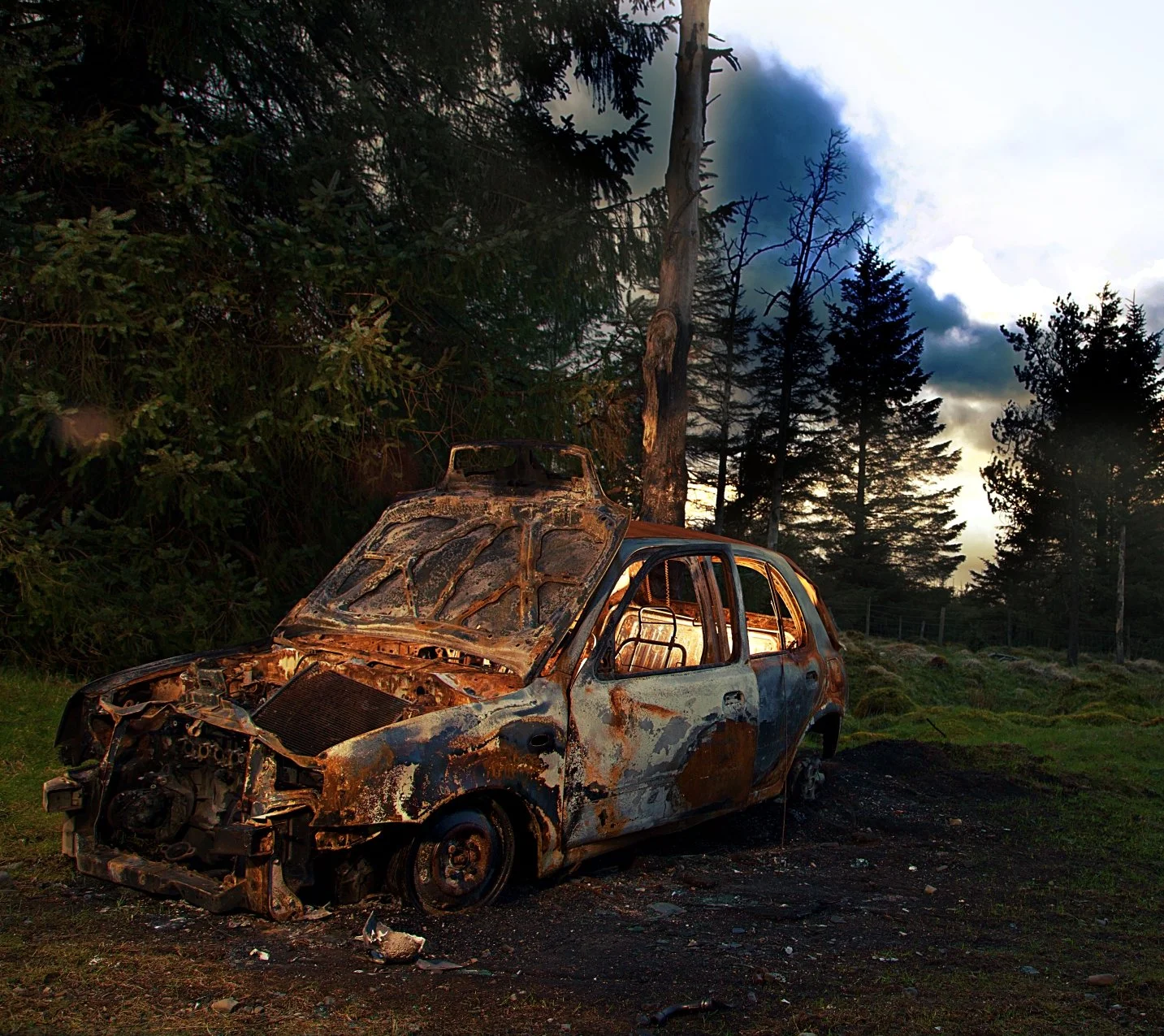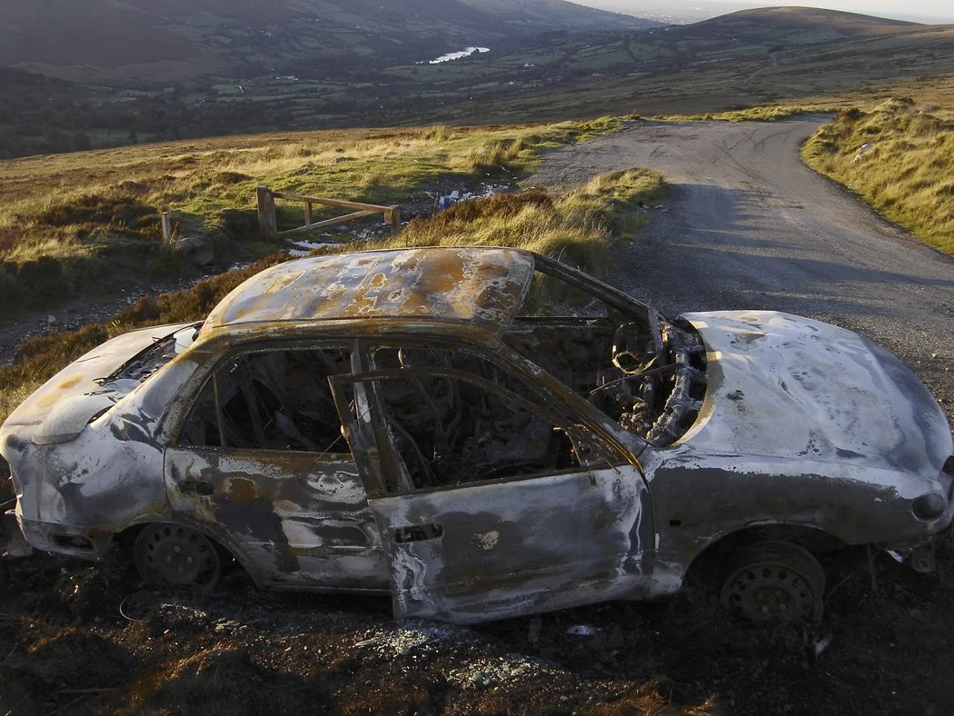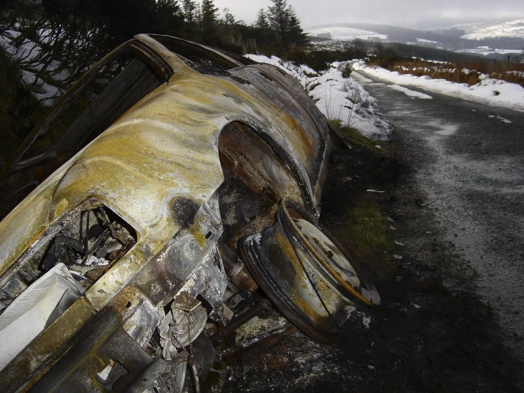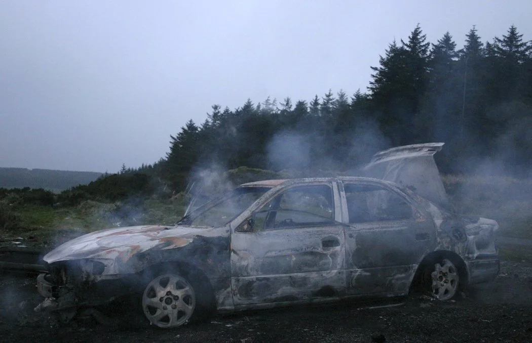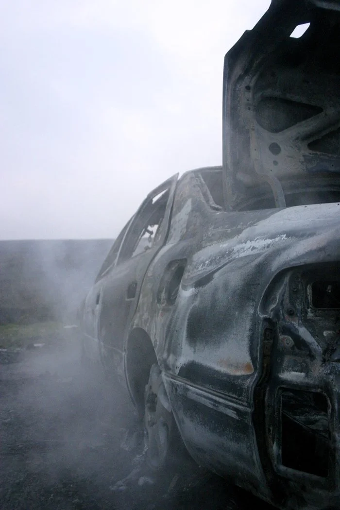 This work was made in 2006. During that year it was hard not to find an abandoned and burned out car in the Dublin mountains on almost any given day. The practise of ‘Joy Riding’ is of North American origin and became popular as a term in Britain and Ireland in the early 1910s. It was defined as ‘to ride at high speed’ and initially applied to all those who took their cars out for recreational drives. It was later used negatively to describe car owners who took non-essential rides at the time of petrol shortages during World War One. By the end of 1930, the Garda announced that an average of three cars a day were being stolen by joy riders in Dublin city. The vast majority of which were found abandoned and undamaged twenty four hours later. Often they were found within a few miles of the city, having been driven until the petrol supply is exhausted.