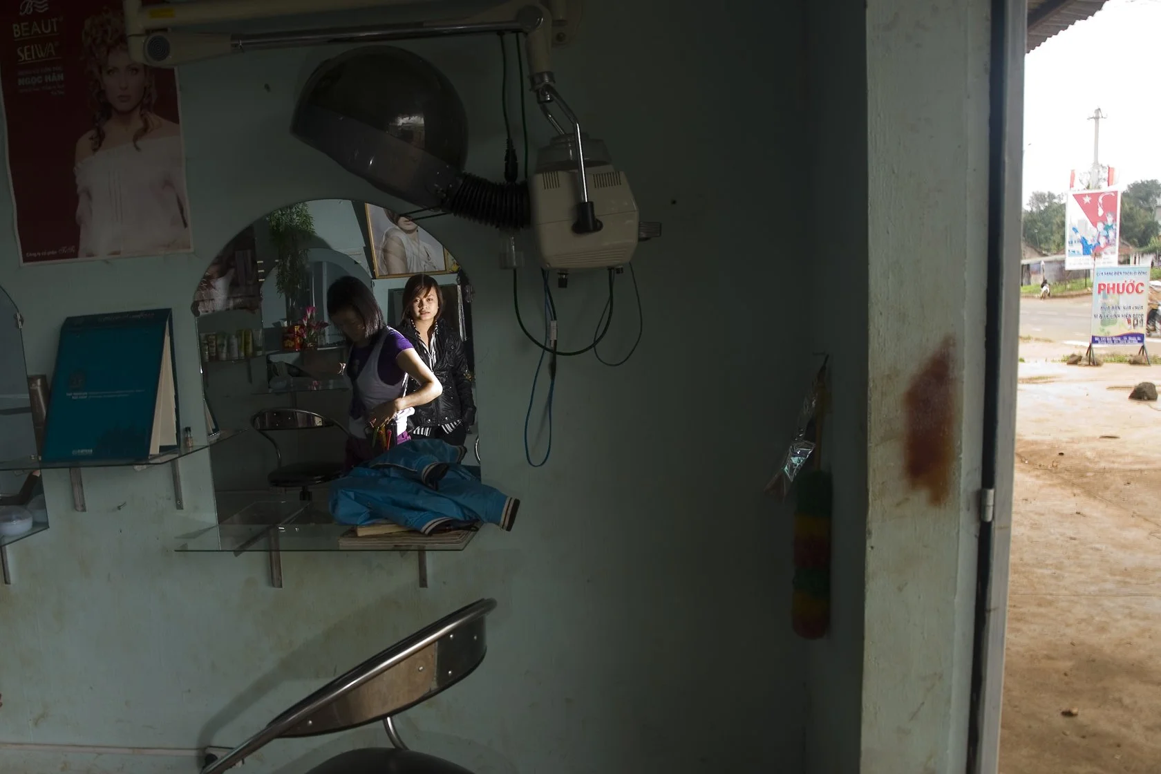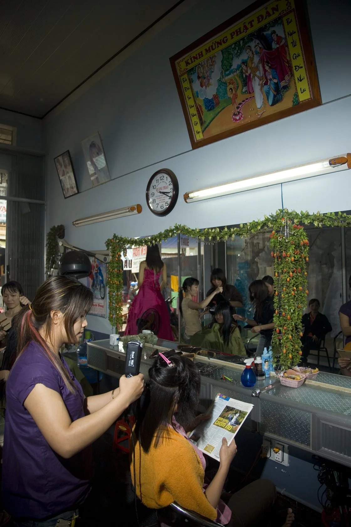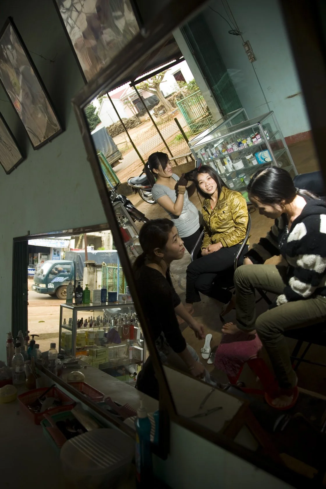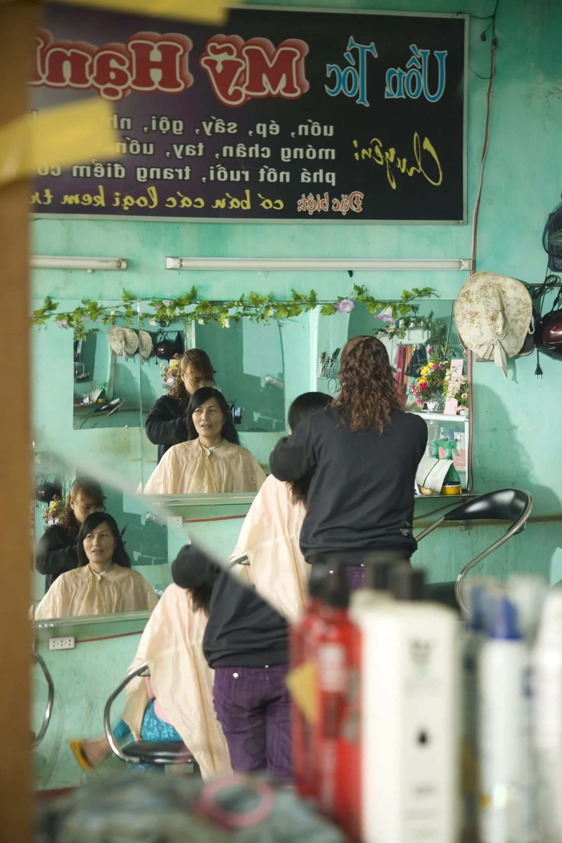 I arrived in Vietnam in October 2009. It was my second or third time there visiting my fiancee, Linh. I was to stay in her village in the province of Dal Lake for as long as it took to get married and then return to Ireland. In the event it took more than 10 months for everything to fall into place. As I travelled around locally with my camera in hand I was drawn to the hair salons in her village. The salons in Vietnam seemed primitive compared to what I saw in Dublin. I was attracted to them and decided to start photographing them over time at every opportunity. My wife of course helped to translate my objectives to the startled staff and customers and it made access straight forward. Both customer and staff were very obliging and I’m sure they thought it odd that an Irish man (a foreigner) would find any interest in them. In the end I was satisfied with my results in this project and it would be interesting to continue to make more when I return imminently.