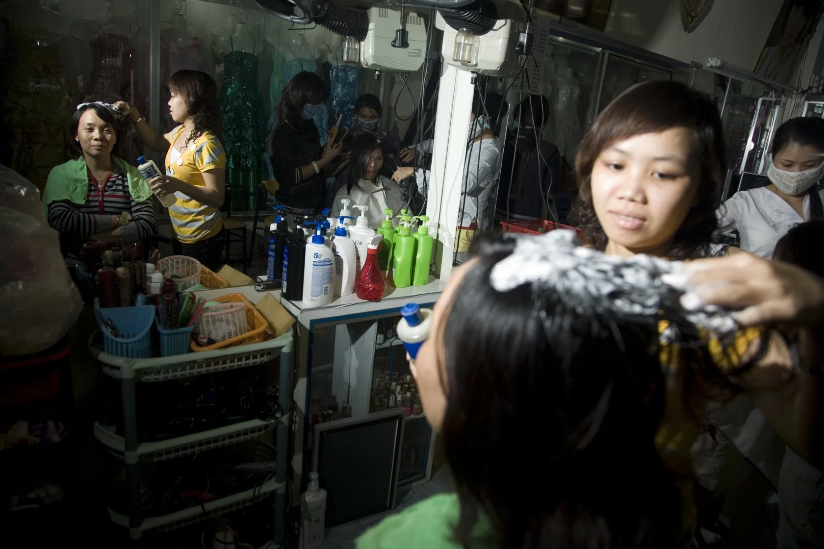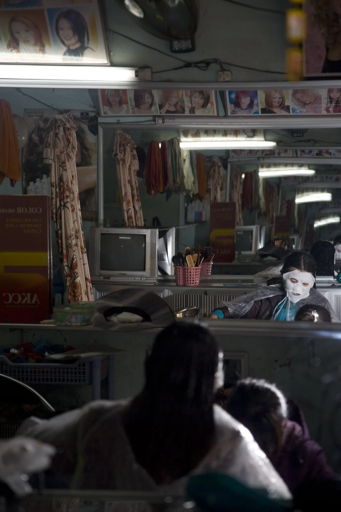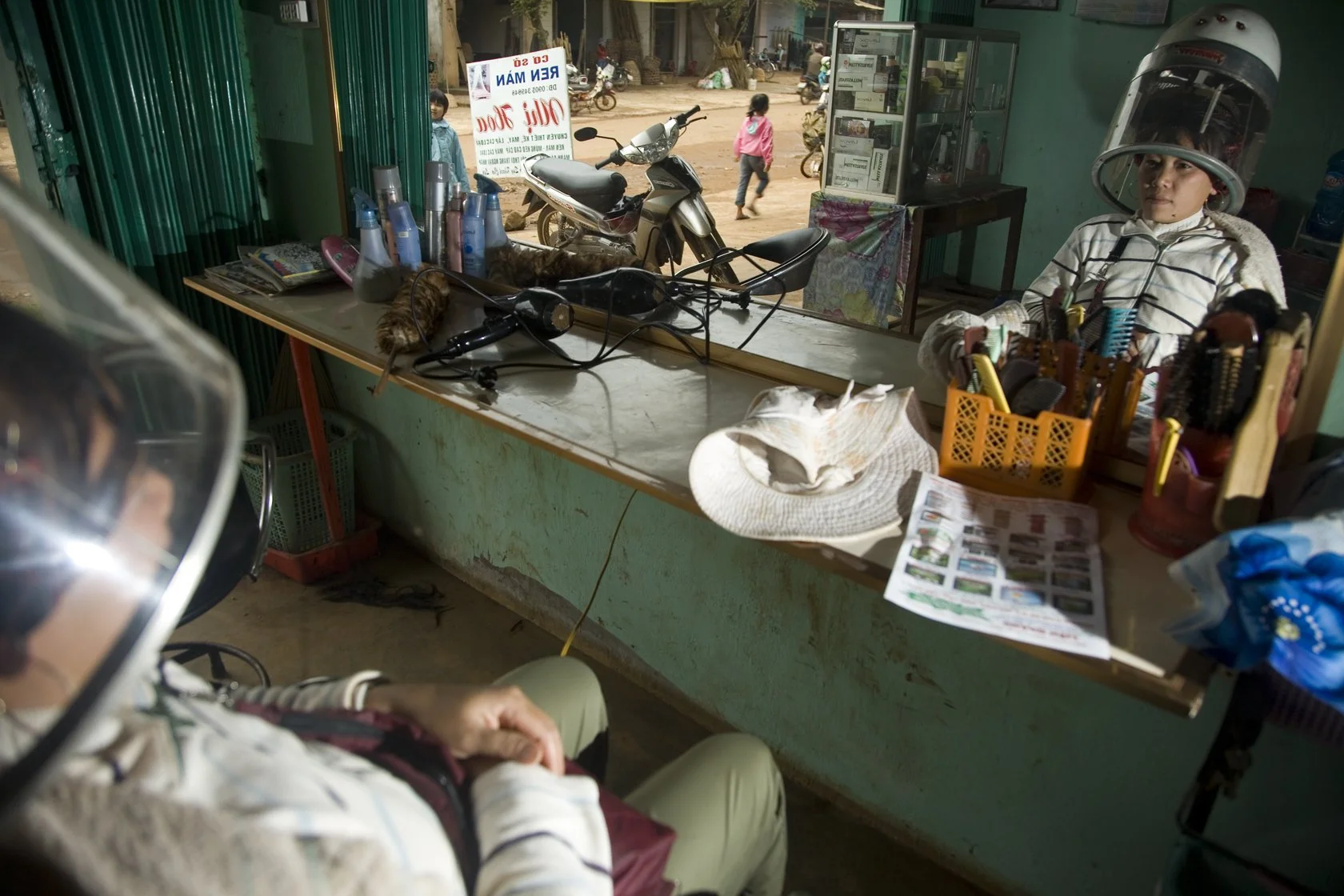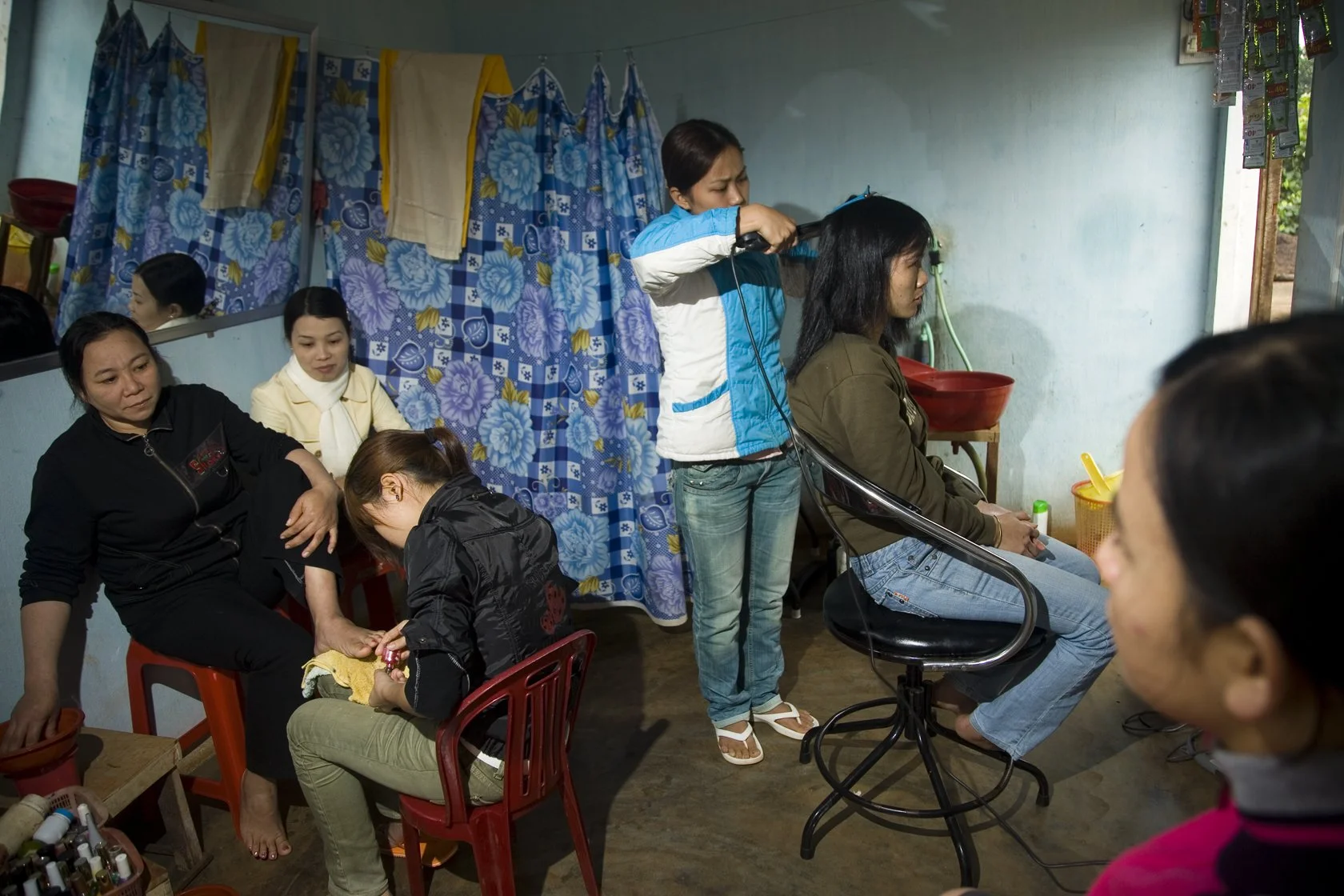 I arrived in Vietnam in October 2009. It was my second or third time there visiting my fiancee, Linh. I was to stay in her village in the province of Dal Lake for as long as it took to get married and then return to Ireland. In the event it took more than 10 months for everything to fall into place. As I travelled around locally with my camera in hand I was drawn to the hair salons in her village. The salons in Vietnam seemed primitive compared to what I saw in Dublin. I was attracted to them and decided to start photographing them over time at every opportunity. My wife of course helped to translate my objectives to the startled staff and customers and it made access straight forward. Both customer and staff were very obliging and I’m sure they thought it odd that an Irish man (a foreigner) would find any interest in them. In the end I was satisfied with my results in this project and it would be interesting to continue to make more when I return imminently.